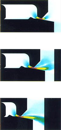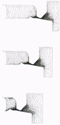 AHPCRC Bulletin: Spring 1994 - Volume 4 Number 2Application of Finite Element Strategies to Nearly Incompressible Liquid FlowGloria Wren, U.S. Army Research LaboratoryA problem of long-term significance to the U.S. Army is the understanding of flow properties of nearly incompressible fluids over moving, complicated geometries at pressures up to 700 MPa. Such problems pose a unique challenge, both for the diagnostic and modeling communities, due to the difficulty in obtaining direct diagnostic data, e.g. flow velocity at these extreme conditions and the numerical challenges imposed by realistic conditions. Fortunately, recent advances in finite element (FE) strategies to solve compressible flow problems have allowed the solution of equations describing challenging applied problems. In particular, a new class of numerical methods has been developed at the University of Minnesota (UM) under the sponsorship of the Army High Performance Computing Research Center (AHPCRC) and the Army Research Office (ARO), to simulate nearly incompressible, barotropic flows, i.e., flows in which small changes in density lead to large changes in pressure. In some cases, limited experimental data for related parameters are available which can be utilized to validate the model. These methods are being applied in a joint effort between the Weapons Technology Directorate, U.S. Army Research Laboratory (WTD/ARL), and the AHPCRC.For example, in the 155 mm, regenerative liquid propellant gun under development by the Project Manager - Advanced Field Artillery System/Future Armored Resupply Vehicle, Picatinny Arsenal, New Jersey, a liquid monopropellant is injected at high pressures from a reservoir through the annulus formed by two moving, cylindrical pistons into the combustion chamber of the gun where it burns, creating combustion gases to accelerate the projectile. Current Army injector designs have evolved empirically based on experimentally measured piston motion and mass flow rate requirements. However, modifications to the injector have been observed to yield unexpected results in some tests, indicating a lack of fundamental understanding of fluid flow in the injector and conditions leading to flow separation and cavitation. In extreme cases, the pistons have been observed to reverse their motion, leading to uncontrolled bulk-burning of the propellant. The modeling effort currently underway seeks to develop a fundamental understanding of the interaction between the piston motion and the liquid propellant flow. Experimentally measured pressures and piston motions can be utilized to validate the model, while the axisymmetric solution provides data on flow field such as velocity and pressure field which cannot be experimentally obtained. Numerical simulation of this problem has been complicated in the past due to a number of serious challenges. The mathematical modeling of the problem is based on the Navier-Stokes equations of compressible flows for the fluid, the equations governing the dynamics of moving components, and the interface conditions governing the interaction between the fluid and the moving components. This results in a time- dependent, nonlinear partial differential equation system that needs to be solved over an intricate computational domain that changes its shape with time. The change in the shape of the computational domain is one of the unknowns of the problem, and needs to be determined as part of the overall solution. In addition, the computational domain in this problem contracts dramatically during the injection process. Furthermore, the fluid dynamics of the problem involve high Reynolds numbers and very low Mach numbers (at the nearly incompressible limit, but with large pressure variations), and each of these two extreme conditions poses a different kind of numerical stability challenge. The geometric complexities involved in the problem require a formulation that can handle moving boundaries and interfaces. The Deformable-Spatial-Domain/Stabilized-Space-Time (DSD/SST) formulation introduced in 1990 by the AHPCRC team, headed by T. Tezduyar, has this capability. This is a new, accurate, general-purpose stabilized finite element formulation for the computation of unsteady flows involving free surfaces, two-liquid interfaces, moving mechanical components, and fluid- structure and fluid-particle interactions. In the DSD/SST method, the stabilized finite element formulation of the governing equations is written over the space-time domain of the problem and therefore, the deformation of the spatial domain with respect to time is automatically taken into account. With the advanced stabilization techniques used in the DSD/SST formulation, the numerical stability challenges involved in the problem are overcome with minimal numerical dissipation and therefore, with minimal loss of accuracy. During the computation, the outer and inner pistons move rearward, with the inner piston motion provided from experimental data. The downstream pressure on the right-hand boundary, representing a location at which the fluid expansion and gas properties will induce atomization, is also provided from experimental data. The mesh updating is performed only when it becomes necessary to do so to prevent unacceptable degrees of mesh distortion. The computation then provides the flow field and the motion of the outer piston. Since both pistons move independently, coupled via the fluid pressure history, the computational domain may change in shape as well as size. A comparison between the measured and simulated outer piston motion and liquid pressure at the rear wall, although not shown, serves to validate the model.