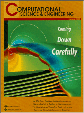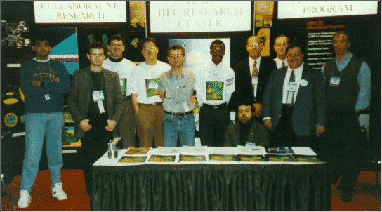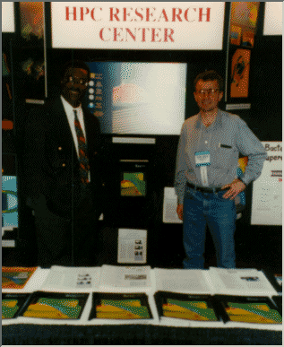 AHPCRC Bulletin: Summer 1994 - Volume 4 Number 4Supercomputing '94At Supercomputing '94, the AHPCRC demonstrated the use of high performance computing to address issues of critical importance to defense science and technology. The demonstrations included the use of scalable high performance computing systems, the heterogeneous computing model, advanced computational libraries, and very high-speed networking to solve complex, three-dimensional real-world problems in computational fluid dynamics, structural mechanics, and interactive battlefield simulation. Supercomputing '94 was held the week of November 14-19 at the Washington D.C. Convention Center.The featured demonstration in the AHPCRC booth was the simulation of the deployment and gliding of a large parafoil. The development of the computational fluid dynamics and finite element techniques to model complex shapes with moving boundaries, such as those seen in parafoils, has been one of the primary activities of the AHPCRC. As part of this work, the AHPCRC and the Natick Research, Development, and Engineering Center (RDEC) are jointly developing the technology to computationally model large gliding para-foils. These parafoils are similar to their smaller cousins, long used in the sporting com-munity. The Army would like to use parafoils of this nature to deliver large payloads, over 20 tons, for soft, precision landings. The use of computational modeling and simulation is ex-pected to considerably reduce the requirement for the construction of prototype parafoils and for field drop tests or wind tunnel tests and is expected to result in substantial reduction in development time and testing. The AHPCRC-Natick computational simulation of a parafoil in steady-state was featured in an Aviation Week and Space Technology article (Vol. 141, No. 22) on the use of high performance computing. It was also honored by being featured on the cover of the Summer 1994 issue of IEEE Computational Science & Engineering (see Figure 1), and was one of the two AHPCRC collaborative research activities to receive prominent exposure in the official Conference calendar for 1995 (see Figure 2). The other, the parallel finite element computation of missile aerodynamics (see Figure 3), came from a joint project with the Army Research Laboratory (ARL) to evaluate Navier-Stokes techniques for the prediction of the separated flow fields about missile configurations at large angles of attack. The simulation of the fluid flow inside a regenerative liquid propellent gun, a project conducted in collaboration with the ARL, was demonstrated using the heterogeneous computing model. In this application, an implicit finite element code, running on the AHPCRC CM-5, was coupled with a direct solver running on the Minnesota Supercomputer Center (MSCI) Cray C90. The two systems communicated over a high-speed HIPPI channel using the HIPPI Remote Procedure Call Library developed by the AHPCRC. An ARL-led project illustrated the use of scalable high performance computing and high speed networking to create an interactive battlefield testbed. The testbed allowed a user to define geotypical terrain at high resolution. A terrain database was generated on the CM-5 at the AHPCRC and broadcast via an Asynchronous Transfer Mode (ATM) DS-3 line, provided by US Sprint, from Minneapolis to the Washington, D.C. Convention Center. The terrain database was then used in an interactive battlefield simulation. The terrain data was rendered by the ARL Stealth program and displayed on workstations in the AHPCRC and DoD High Performance Computing Modernization Program booths. TerraVision, a "real" terrain visualization system and an application being used to evaluate the capability of the MAGIC Gigabit Testbed was also shown. TerraVision is a sy-stem for visualizing in real-time, a synthetic re-creation of a real landscape created from ele-vation data and a large number of aerial images of that landscape. TerraVision's goal is to allow a user to travel above or across a terrain at will. TerraVision is designed to provide the observer, in real-time, a view which can change from a panoramic perspective to the close-up details of the terrain. The TerraVision application demonstrated at Supercomputing '94 util-ized a terrain dataset of the Army National Training Center at Fort Irwin, CA. The terrain data was available to the user either from local Image Server Systems (ISS) at 100 and 140 megabit/second ATM, or from remote ISSs over US Sprint's DS-3 ATM network into the MAGIC backbone network. Participants in the MAGIC Gigabit Testbed Project include organizations from government, industry, and academia, such as the Earth Resources Observation System Data Center; US Geological Survey; Lawrence Berkeley Laboratory; US Department of Energy; MSCI; SRI; University of Kansas; MITRE Corporation; AHPCRC; Battle Command Battle Laboratory; US Army Combined Arms Command; Digital Equipment Corporation; Northern Telecom, Inc./Bell Northern Research; Southwestern Bell Telephone; Splitrock Tele-com; US Sprint; and US West Communictions, Inc. Carissa Baker (Howard University) displayed results from her research project, from the AHPCRC 1994 Undergraduate Summer Institute for "Analyzing DNA Sequences". Carissa and fellow 1994 Undergraduate Summer Institute graduate, Jabari Lee (Jackson State University) hosted visitors to the AHPCRC booth and provided information on their experiences and activities in high performance computing. Many AHPCRC researchers and staff who were present at the AHPCRC booth (see Figure 4) described and demonstrated to the visitors the AHPCRC research, infrastructure support, education, and outreach programs. Visitors to the AHPCRC booth included those from Army sites, ARO, and the academic partners of the AHPCRC (see Figure 5). In keeping with the theme of the importance of high performance computing in solving critical defense problems, still images depicting results from other key Army and AHP