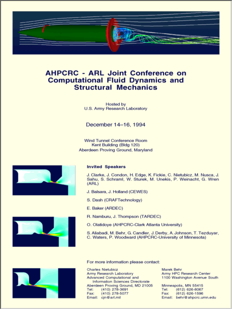 AHPCRC Bulletin: Winter/Spring 1995 - Volume 5 Number 1-2AHPCRC and ARL Hold a Joint Conference on CFD and Structural MechanicsMarek Behr (AHPCRC) and Charles Nietubicz (ARL)The Army Research Laboratory (ARL) hosted an AHPCRC-ARL Joint Conference on Computational Fluid Dynamics and Structural Mechanics at Aberdeen Proving Ground, Maryland in December 1994. The organizing committee was headed by Charles Nietubicz, Acting Chief of the Technology Integration Branch of the Advanced Simulation and High Performance Computing (ASHPC) Directorate at the ARL, and by Marek Behr from the AHPCRC-UM. The conference was aimed at initiating and intensifying collaboration between ARL, the Army Research Development and Engineer Centers (RDECs) and the academic partners of the AHPCRC. The host organization, the ARL, is a major Army resource for basic and applied research. It consists of eleven directorates, with the largest concentration of facilities located in Maryland. The conference opened on December 14 with welcoming remarks by William Mermagen, the Director of the ASHPC Directorate at ARL, and a set of introductory remarks by AHPCRC Director Tayfun Tezduyar and conference co-chairman Nietubicz. The speakers commented on the importance of the ARL-AHPCRC collaborative efforts to the success of the AHPCRC mission during its second contract period which commenced in January 1995. Some of these efforts are already underway and have achieved a degree of success. More faculty members, postdoctoral fellows, and graduate students at the AHPCRC-affiliated educational institutions are to be involved in the joint research projects.The first session of the conference opened with presentations by Kurt Fickie (ARL) on deformation and permeability in flow through porous media, and by Jeffrey Derby (AHPCRC-UM) on massively parallel finite element computations in materials processing research. The next session focused on Interior Ballistics research. Gloria Wren (ARL) reviewed physical problems in interior ballistics of guns, Sandy Dash (CRAFTechnology) spoke on CRAFT code simulations of multi-phase combusting flow and Michael Nusca (ARL) described the progress on the Army Next Generation Interior Ballistics Code. An overview of CFD research at Waterways Experiment Station was given by Jeffrey Holland (WES). Then, Tezduyar summarized the finite element computations of several flow problems currently being worked at the AHPCRC. The session was concluded with three more presentations from the Minnesota team. Shahrouz Aliabadi (AHPCRC-UM) described his work in 3D parallel finite element simulations; Behr described key concepts encountered in utilization of massively parallel CM-5 and Cray T3D supercomputers; Chris Waters (AHPCRC-UM) reviewed undergraduate student contributions to finite element computations and flow visualization at the AHPCRC. The remaining part of the day was allocated for topical discussion on the subjects of parallel computing and mesh generation, and for one-on-one technical discussions. The panel on mesh generation, led by Nietubicz, discussed current issues related to the need for responsive, interactive grid generation methodology. The need and use of adaptive gridding was also highlighted. The second day of the meeting, December 15, provided for continuation of the one-on-one discussions, followed by a tour of the aerodynamics range. The range is a facility which measures the actual flight motion of projectiles up to 37 mm caliber under realistic conditions. It is the only range in the United States capable of obtaining accurate data on small- and medium-caliber projectiles. The tour continued on to the supercomputing facility, which provides leading-edge computing technology in the form of both scalable massively parallel processors and vector architectures. The ARL facility has also been recently named as one of four DoD Major Shared Resource Centers and will be acquiring and implementing new computing and network facilities as solicited in a Request for Proposal released on February 1, 1995. The topics discussed later that day centered on current computational work in structural mechanics. John Condon (ARL) talked about structural response of structures subjected to mine blast loading. James Balsara (WES) gave an overview of computational structural mechanics at the Structures Laboratory of WES. The computational structural mechanics simulations at Tank-Automotive RDEC (TARDEC) were summarized by Raju Namburu (AHPCRC-TARDEC). After the mid-day break, Ernie Baker (ARDEC) spoke about simulations for warhead design, Graham Candler (AHPCRC-UM) about a data parallel LU relaxation method for the Navier-Stokes equations, and Paul Woodward (AHPCRC-UM), about simulation and visualization of turbulent fluid flow. On the third day, December 16, the attendees heard Michael Unekis (ARL) discuss comparison of massively parallel processors for CFD application and Stephen Schraml (ARL) describe 3D simulations of time-dependent flow in multi-drive shock tubes. Subsequently, Jubaraj Sahu (ARL) gave a presentation on the Chimera technique which is employed to simulate flow past projectiles in relative motion. In the last presentation of the session, Olugbemiga Olatidoye (AHPCRC-CAU) described trends in CFD and structural dynamics computations at Clark Atlanta University (CAU). The second session of the day consisted of talks by Harris Edge (ARL) on zonal calculations for wrap-around missile fin configurations, by Paul Weinacht (ARL) on aerodynamic predictions for finned projectiles, and by Walter Sturek (ARL) on CFD code validation. After the lunch break, Andrew Johnson (AHPCRC-UM) discussed automatic mesh generation and update issues arising in 3D finite element fluid flow computations. Jerry Clarke (AHPCRC-ARL) continued with a presentation of a network distributed global memory model and its use in distributed interactive flow field simulator. The final talk of the session was given by Steve Wilkerson (ARL
