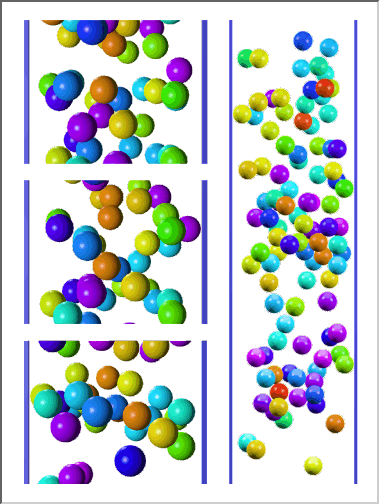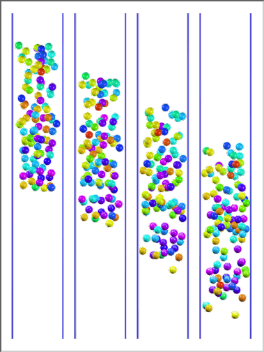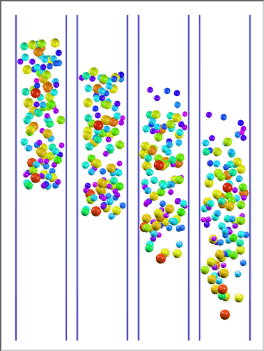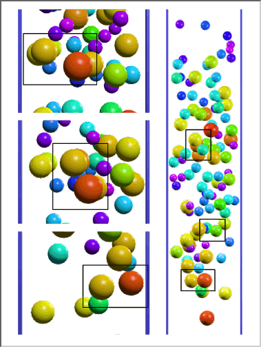 AHPCRC Bulletin: Winter/Spring 1996 - Volume 6 Number 1-2Fluid-Particle Simulations Reaching 100 ParticlesAndrew Johnson and Tayfun Tezduyar (AHPCRC-UM)We have developed a new high performance computing tool for 3D simulation of fluid-particle interactions with the number of particles reaching 100. The mathematical modeling is based on the time-dependent Navier-Stokes equations governing the flow around the particles and Newton's law of motion governing the 3D dynamics of the particles with the fluid forces acting on these particles calculated from the flow field. In developing this tool, we started with the set of methods we developed earlier for simulations involving an order of magnitude less particles (see "Automatic Mesh Generation and Update Strategies in 3D Flow Simulations, AHPCRC Bulletin, Fall 1994-Vol. 4 No. 4) and used some of these methods. Bringing the capability to this level, however, also required introducing new methods developed by taking into consideration issues that we were not so concerned about when the number of particles was much fewer. This tool is capable of keeping the computing durations involved in this class of simulations to acceptable levels.At the core of this tool are the stabilized space-time finite element formulation for moving boundaries and interfaces and implementation of this formulation on parallel platforms. The surrounding methods include: fast automatic mesh generation with structured layers of elements around particles, a mesh update method based on automatic mesh moving with remeshing only as needed, an efficient method for projecting the solution after each remesh, surface mesh refinement to increase accuracy when two solid surfaces get close, and multi-platform computing with high-speed inter platform communication. In these simulations, while the mesh partitioning, flow computations, and mesh movements are performed on the AHPCRC's 512-node CM-5, the mesh generation and projection is accomplished on the AHPCRC's 20-processor SGI Onyx system. The two platforms communicate via a HiPPI channel. To test and demonstrate this new capability, we applied it to the simulation of 101 spheres falling in a liquid-filled tube. The spheres, in addition to interacting with the fluid, interact and sometimes collide with each other and with the tube wall. We simulated two cases with 101 spheres: with the size of the spheres random in one case and uniform in the second. In both cases, the simulation is started with the spheres distributed randomly in the tube. The mesh sizes during these simulations reach 1.2 million tetrahedral elements (resulting in approximately 2.6 million coupled, nonlinear equations to be solved at each time step), and the number of time steps is around 800. Figure 1 shows the simulations for both cases, where the approximate, average Reynolds number is 40. These particular simulations are not meant to be in depth studies of this class of fluid-particle interactions but are intended to show how the advanced computational methods developed, together with modern parallel computing platforms, enable us to carry out this difficult class of simulations at levels that would have been unthinkable a few years ago.