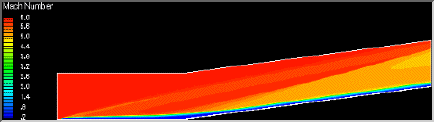 Figure 1 shows the Mach contours for a compression corner flow. The boundary layer at the leading edge of the plate causes a weak shock wave to form. The boundary layer and recirculation zone at the corner of the plate and wedge can also be seen in the Figure. Finally, the shock wave formed at the corner is also visible.