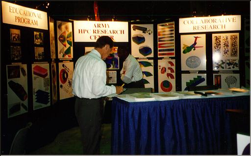AHPCRC Bulletin: Fall 1996 - Volume 6 Number 4SUPERCOMPUTING '96Gary Hansen (AHPCRC-MSCI)At the Supercomputing '96 Conference, the Army High Performance Computing Research Center again demonstrated, via many numerical simulations, the importance of high performance computing (HPC) in the solution of critical defense problems. Supercomputing '96 was held November 17-22 in Pittsburgh.In keeping with the theme of the importance of HPC in solving critical defense problems, graphic still images depicting results from key Army and AHPCRC research projects were displayed on the walls of the exhibit. These included Numerical Simulation of Paratrooper-Aircraft Interaction (Natick RDEC), Theater Missile Defense Interceptor (AHPCRC), Parallel Finite Element Simulation Flare Maneuver of a Large Ram Air Parachute (Natick RDEC), Chemical Transport Through Porous Media (Corps of Engineers Waterways Experiment Station [CEWES]), METIS: Unstructured Graph Partitioning Software (AHPCRC), Sloshing in a Tanker Truck (AHPCRC), Simulation of Flows in Waterways (CEWES), 3D Parachute Flow Field Computation (Natick RDEC), and Convective Mixing During Growth of Single Crystal KTP from Solution (AHPCRC).