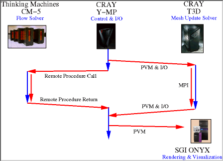 One of the highlights for the AHPCRC at Supercomputing '96 was the Center's participation in the "High Performance Heterogeneous Computing Challenge," an annual contest in which participants demonstrate their ability to run HPC applications whose solution is spread across multiple HPC platforms. The Center's entry, the simulation of fluid flow surrounding a deformable parachute, demonstrated the feasibility of using large-scale heterogeneous parallel computations to solve timely fluid-structure interaction problems. As demonstrated by the AHPCRC team, the benefits derived from such capacity-driven computations are directly related to the diverse analysis tools which such parallelism provides. To perform this simulation the computational work was divided among four HPC systems, using three parallel programming models, working simultaneously on various parts of the problem. The four different HPC systems (each with a different architecture) and the respective problem parts they addressed were the Thinking Machines CM-5, providing the fluid dynamics flow solver; the CRAY Y-MP, providing problem synchronization and I/O; the CRAY T3D, providing the finite element mesh update solver and movement; and the Silicon Graphics Onyx, providing the rendering, visualization performance monitoring, and job control. The parallel programming models utilized included MPI (on T3D) and PVM (T3D to Y-MP and Y-MP to Onyx) message-passing; data-parallel (on CM-5); and remote procedure calls (CM-5 to Y-MP). The networking utilized to connect the various platforms included HiPPI, ATM, and the direct I/O channel between the T3D and Y-MP.