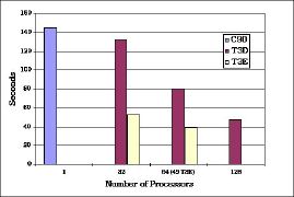 The initial attempt to port the F3D code to a scalable architecture involved the CRAY T3D and CRAFT shared memory programming model. The advantages of code maintainability and ease of transition was offset by the poor performance, and alternative approaches were explored. The more difficult task of rewriting the code in a message-passing framework was undertaken, and the PVM-based code provided initial speed-ups. The reshaping of the arrays during solver sweeps however was a difficult target for efficient implementation when using two-sided PVM communication. A much better solution was found in the form of the one-sided SHMEM CRAY communication libraries [2]. In addition to eliminating concerns about deadlocking, the use of SHMEM reduces message latency and increases bandwidth. The problem of SHMEM non-portability was addressed with transition of the SHMEM calls to equivalent Bulk Synchronous Parallel (BSP) library calls [3, www.bsp-worldwide.org]. The BSP library, developed at Oxford University, provides one-sided communication capabilities equivalent to SHMEM on a wide range of distributed memory machines, including IBM SP2 and SGI PCA. Apart from the communication issues, the scalar optimization of the code was attempted in order to extract a reasonable fraction of peak speed on cache-constrained architectures, but that aspect still leaves something to be desired. The current code speed-up on the CRAY T3D and T3E platforms reach a factor 3.7 over the C90 for the 49-PE T3E (Figure 3), using Mach 1.8 flow past an ogive cylinder on a 3-zone 1-million cell grid as a benchmark case. Future Activities The current implementation allows only for a single-cell overlap between separate zones. Many cases of interest to WMRD involve moving grids for aerodynamic computations of multibodies in relative motion [4]. A more general interpolation scheme is required for data exchange between zones, and such a scheme is incorporated in a Chimera version [5] of the vector implementation. Addition of the Chimera methodology to the scalable version of the F3D is the main goal of future work. References