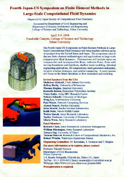 AHPCRC Bulletin: Summer 1997 - Volume 7 Number 3Fourth Japan-US Symposium PlannedAnita Anderson (AHPCRC-UM)The Fourth Japan-US Symposium on Finite Element Methods in Large-Scale Computational Fluid Dynamics is planned for 2-4 April 1998, at Nihon University in Japan. This bi-annual Symposium, organized this year by the Japan Society of Computational Fluid Dynamics, alternates sites between Japan and the United States. The previous symposium was held in Minneapolis, Minnesota, in April 1996, and was co-sponsored by the AHPCRC.Tayfun Tezduyar, AHPCRC Director, will once again participate in this event as a member of the Organizing Committee and by presenting his research funded in part by the AHPCRC. Other AHPCRC and Army researchers invited to share the results of their research at the Symposium include: Shahrouz Aliabadi (Clark Atlanta University), Jeffrey Derby (University of Minnesota), Keith Stein (Natick Research, Development, and Engineering Center), and Walter Sturek and Gloria Wren of the Army Research Laboratory (ARL). Paul Muzio, the AHPCRC Executive Director for Infrastructure (Network Computing Services, Inc.), will present a paper describing current and future trends for high performance computing platforms in the United States. Also from the Army, Richard Chait (Office of the Assistant Secretary of the Army for RD&A), William Mermagen (ARL), and Robert Whalin (Corps of Engineers Waterways Experiment Station) will participate as panel speakers.
