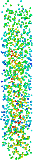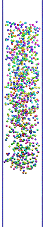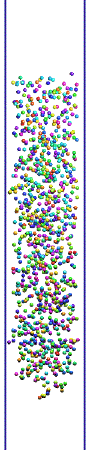 In this simulation, we start with the 1000 uniform-sized spheres dispersed randomly in a section of the tube (see Figure 1, first picture). The Reynolds number for a single sphere falling at terminal speed is 10. The mesh has approximately 2.5 million tetrahedral elements. At every time step, a nonlinear equation system with approximately 5.5 million equations needs to be solved simultaneously. At this problem size, the flow solver can compute 30 time steps in about 7 hours on the 512-node CM-5, generate a new mesh in about 4.5 minutes on a single MIPS R10K processor, and project the solution in about 18 minutes on two MIPS R10K processors. We computed a total of 800 time steps with 56 remeshes. The average Reynolds number at terminal velocity is around 8.1. The spheres at four instants during the simulation are shown in Figure 1. This fluid-object system involves behavior patterns not seen in our earlier simulations with 101 spheres. An example of this is that the spheres near the center of the tube fall with higher speeds compared to those near the sides, and this can be seen in Figure 2. This behavior is demonstrated also in Figure 3. Related to this behavior, the spheres near the center exit the group at the bottom and then spread out to the sides to fill up the open spaces.