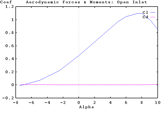 An opened inlet mesh with sharpened opening edges was ran through angles 6 to 10 degrees and compared to the Open-inlet Mesh. There is no significant difference in the coefficients of Lift and Drag.