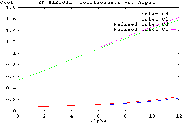 An inlet mesh(refinement value: 0.005) was compared to a refined inlet mesh(refinement value: 0.003) ran through angles 6 to 12 degrees. There is no significant difference in the coefficients of Lift and Drag.