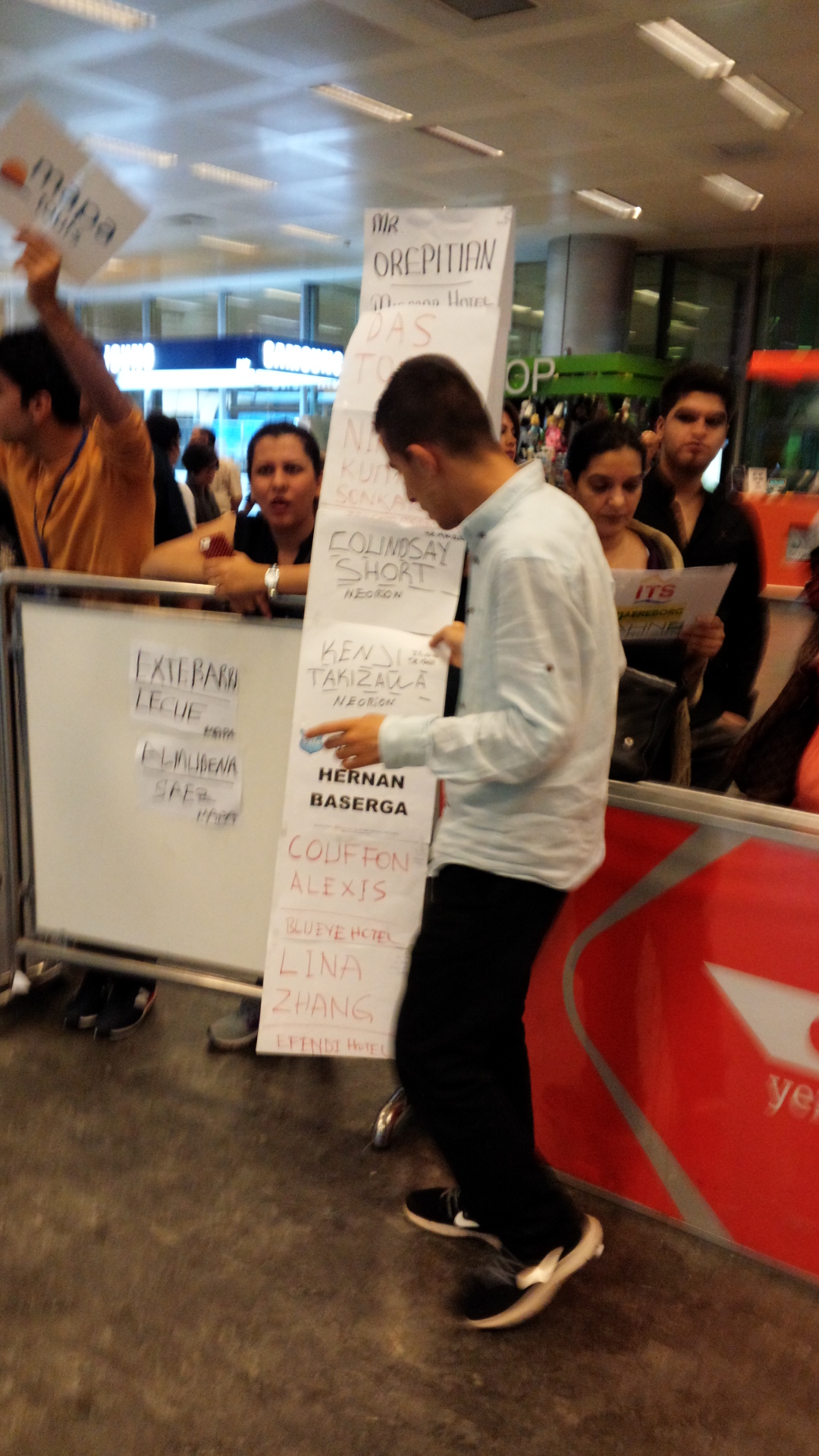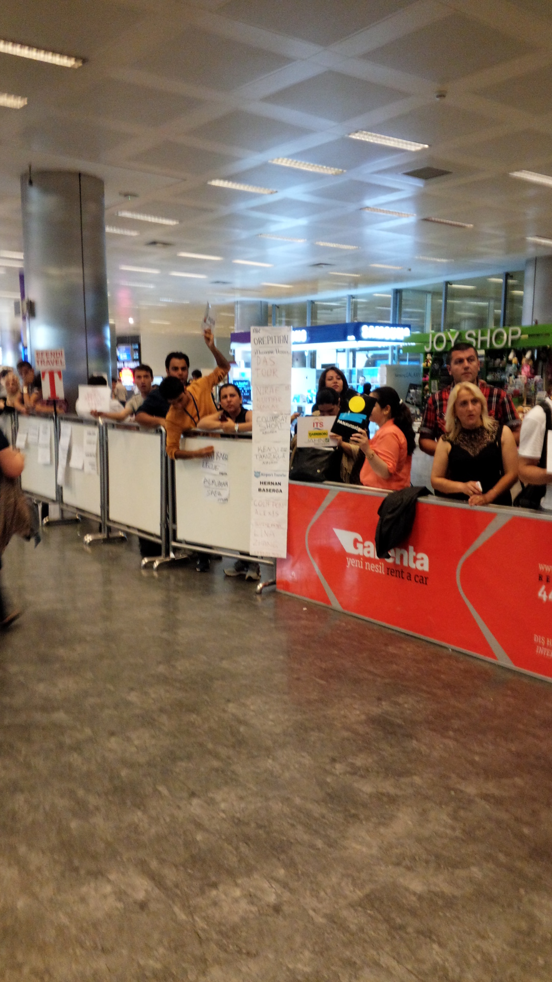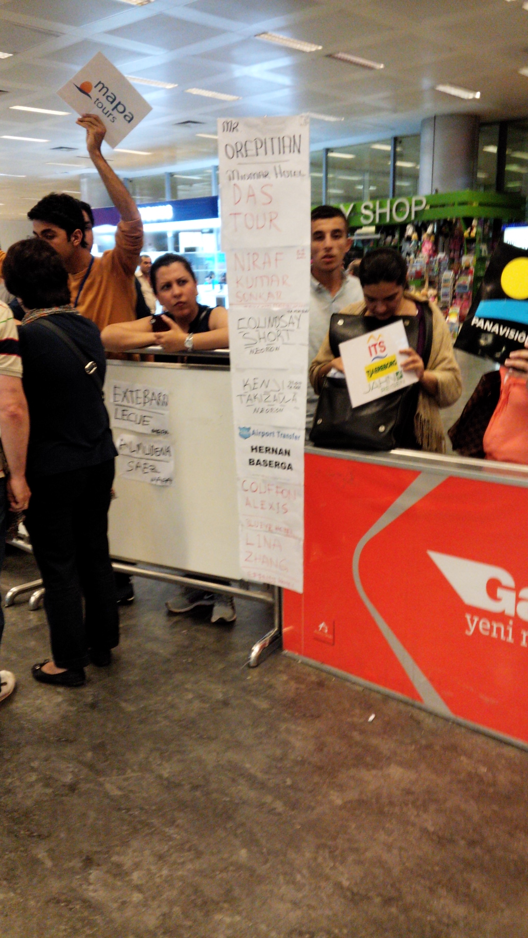 You should fly to Istanbul Ataturk Airport (IST). If your reservation at one of the short-course hotels includes airport pickup, you will be met at the customs exit as you see in the photos below. Look for your name carefully among the many names you will be seeing.