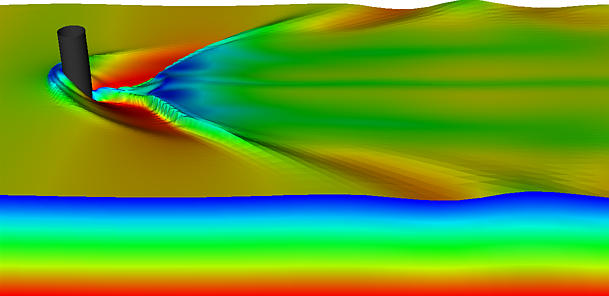 Free-Surface Flow Past a CylinderIn this study, we simulate free-surface flow past a circular cylinder standing vertically. The Reynolds number based on upstream velocity and cylinder diameter is 10 million. The upstream Froude number is 0.564. The Deformable-Spatial- Domain/Stabilized Space-Time (DSD/SST) formulation is used with an algebraic mesh update method to solve this problem. The mesh consists of 230,480 triangular-based prism elements and 258,764 space-time nodes. The free surface height is governed with kinematic free-surface condition and solved with, again, a stabilized formulation. The figures below show, at an instant, the cylinder together with the free surface color-coded with the velocity magnitude and side boundary surface color-coded with the fluid pressure. The bow wave in front of the cylinder, the hydraulic jump behind, and the V- shaped waves in the wake are characteristics of this flow problem. The computations were carried out on a CM-5. The mesh generator and flow solver were developed by the T*AFSM