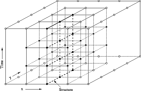 Multiscale Space-Time TechniqueThe Enhanced-Discretization Space-Time Technique (EDSTT) provides a multiscale space-time framework where fluid-structure interaction (FSI) computations can be carried efficiently and accurately even when the structural dynamics part requires a much smaller time-step size. Only the time-step size for one or a few layers of fluid mechanics elements needs to match the structural dynamics time-step size, and for the rest of the fluid mechanics elements the time-step size is determined based on the requirements of the fluid dynamics part. The EDSTT was introduced in [1-2], and the test computations were reported in [3]. The EDSTT is based on using, in the context of the Deforming-Spatial-Domain/Stabilized Space-Time (DSD/SST) formulation [4-7], multiscale function spaces associated with multiple space-time finite element meshes. For the fluid mechanics part, the second space-time mesh, which has the smaller time-step size, is built on top of the first one, adjacent to the structure and covering only one or a few layers of the first mesh. The efficiency of the EDSTT becomes even more dramatic when the structural dynamics part has a lower dimension than the fluid dynamics part. In the EDSTT, the two different time-step sizes are used in the fluid dynamics part in an implicit fashion, and therefore the technique possesses the desirable features of the implicit methods. In the 2D FSI test problem reported in [3], flow past a thin, flexible beam is computed with a structural dynamics time-step size that has to be 20 times smaller than the fluid dynamics time-step size.